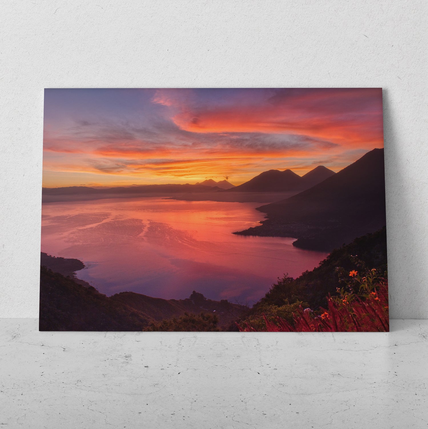 - Los cuadros impresos en papel fotográfico montado sobre MDF están colocados sobre una base de madera.